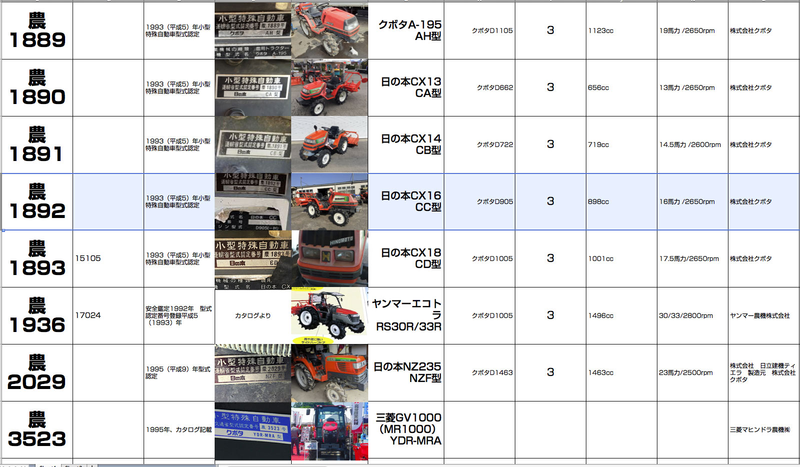 『農機の運輸省型式認定番号一覧表』に追記しました