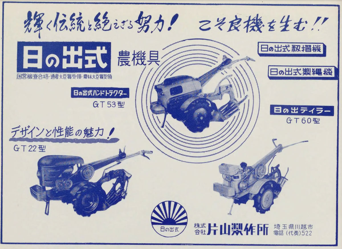 もう実機は見られないであろう運輸省型式の若い番号の古い農機を本や雑誌から探している「朝1分の農機考古学」。今朝はそのカワイイ姿に魅せられながらもずっと名前がわからなかったトラクターの名前が、主要農機工業信用録の広告から1960年農林省検査合格、片山製作所の日の出式GT53だとわかったお話です。
