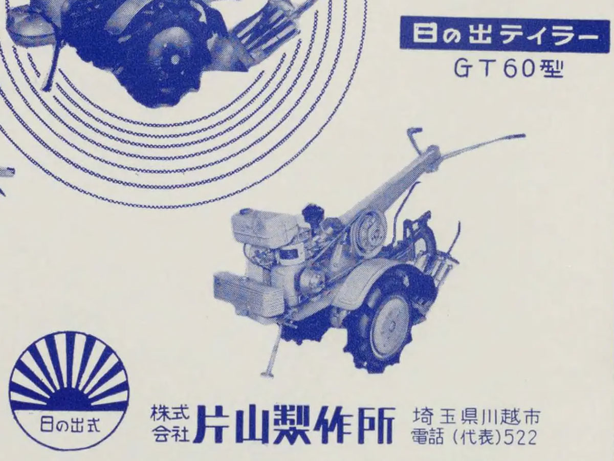 もう実機は見られないであろう運輸省型式の若い番号の古い農機を本や雑誌から探している「朝1分の農機考古学」。今朝は主要農機工業信用録の広告から1960年型式認定、片山製作所の日の出式GT60です。1958年のGT2型(GT1型もしくはGT型は存在しないか未発見)から始まった日の出式GT型もわずか2年で二桁・・・耕運機の競争が激しかったことが伺えます。