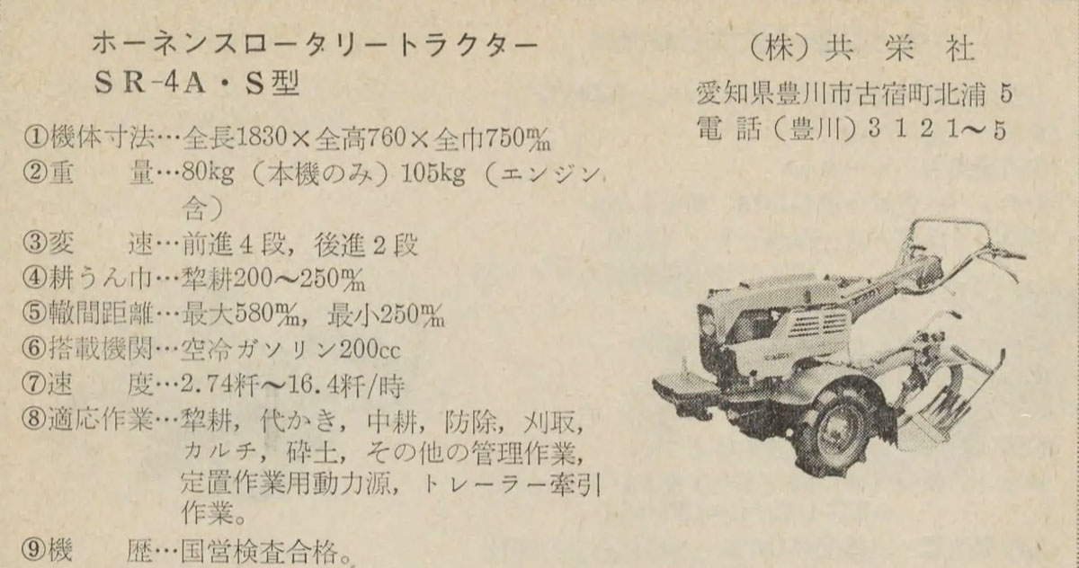 今朝の「朝1分の農機考古学」は昨日の記事でヰセキK48Cが2つ運輸省型式認定番号を持っているのは資料の誤植(459ではなく495)でした・・・と、実際の農459はシバウラのSR8型が持っていて、そのSR8型はホーネンスからOEM供給を受けたのじゃないかという大胆予想です。