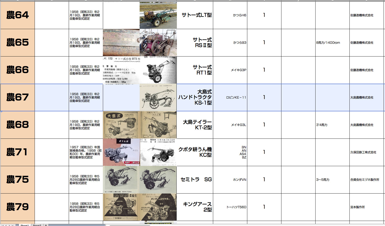 となっています。通常、「ブランド名」「型式名(アルファベットと数字や記号の組み合わせ)」と分かれるのですが、この場合「大島式ハンドトラクタ」「KS-1」となるのか「大島式」「ハンドトラクタKS-1」となるのかハッキリしません。現在はこういうことはありませんが、こういうところも制度創設黎明期の混乱した(もしくはおおらかな)感じが出ていると思います。