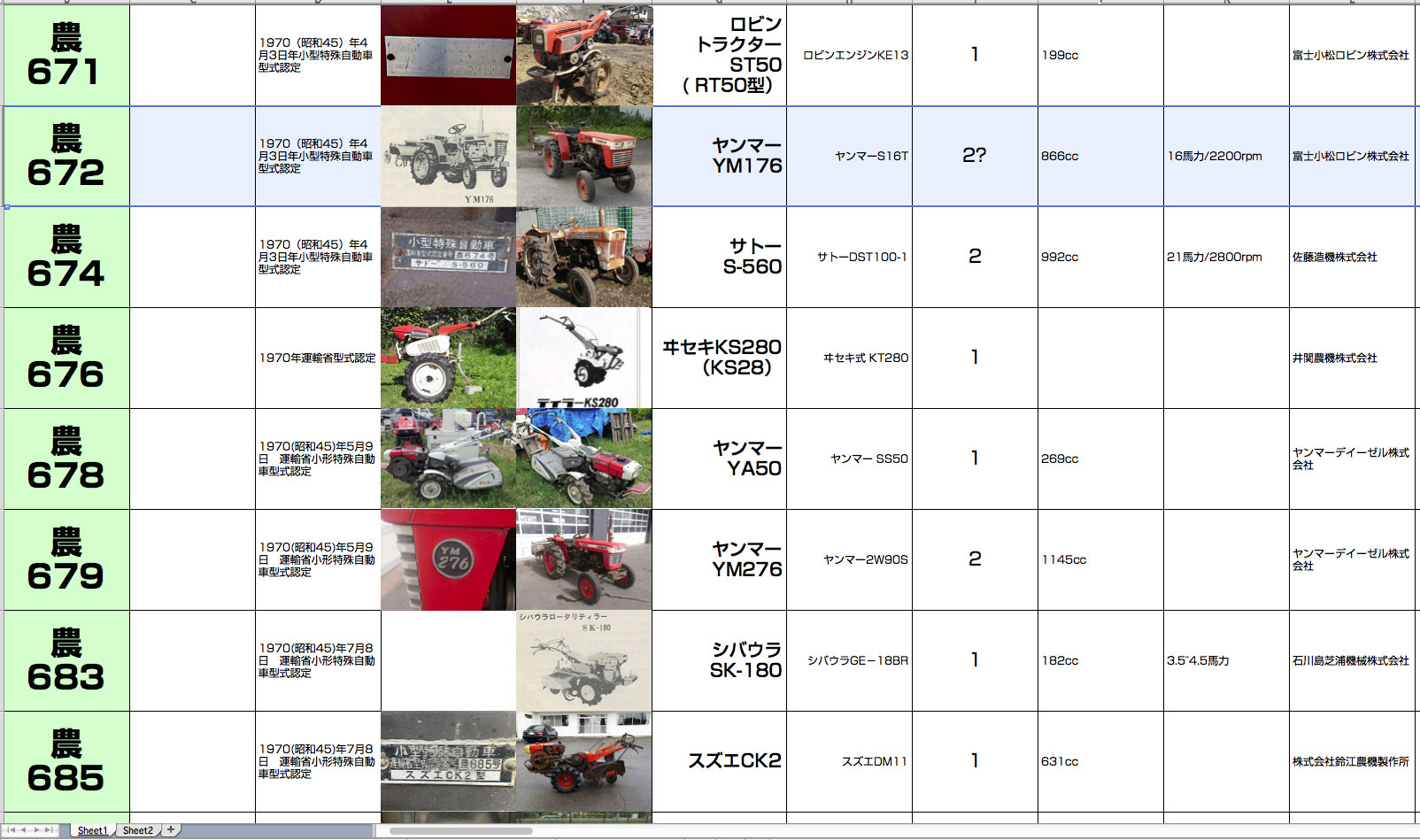 『農機の運輸省型式認定番号一覧表』を固定ページで公開しました。一番上のメニューから入れるようにしています。これから新しく運輸省型式認定番号を発見するたびに追記することにします。