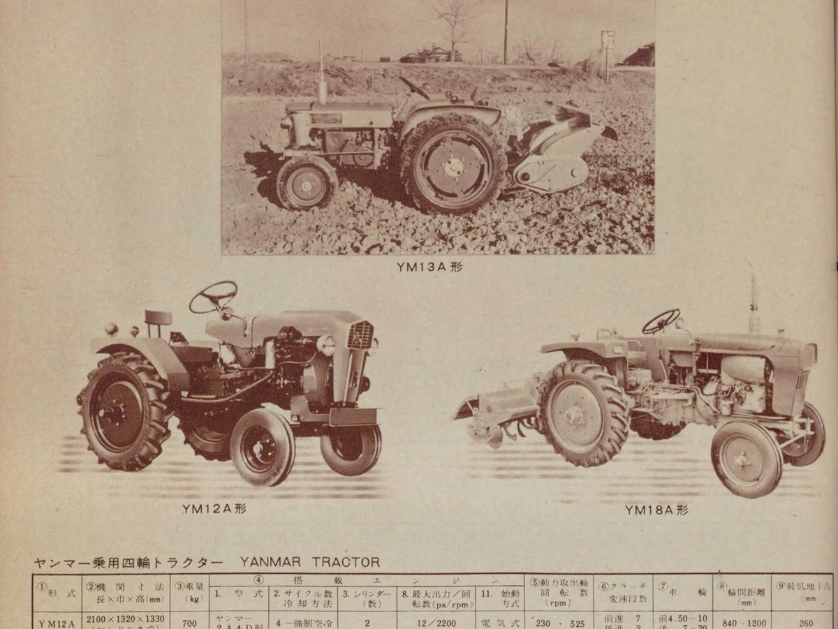となっています。ここでは車名というかナントカ式の部分にヤンマーとあるので、ヤンマーはブランドどして使われていたということなのでしょう。このラインでは乗用トラクターが多く乗用耕運機は見当たりません。乗用耕運機が出てくるのは少しだけ後です。このことから各メーカーは耕耘機の後に乗用トラクターが出したものの、高価なために思ったほど広がりを見せなかったために廉価版である乗用耕耘機を出した・・・そんなふうに見えます。