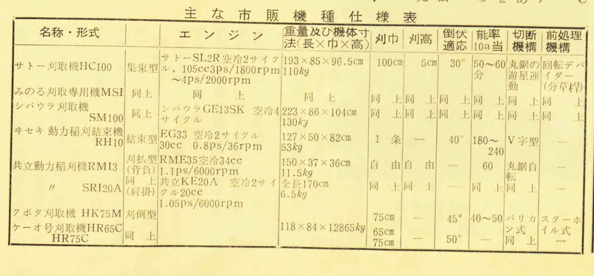 これより先の38年,メーカー各社は刈取作業の機械化について研究を始め,39年にはみのる産業株式会社(岡山県)が遊星式刈取機を発表して衆目を集めたヤンマー農機は,同社と提携しヤンマー刈取機として発売,動力による刈取作業の先端を切ったが,結束機構をもたなかったため,レシプロ式バインダに追い上げられる形になった。