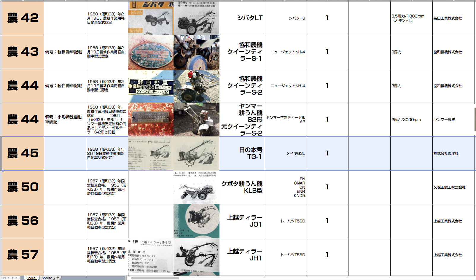 シートに記入します。この制度が始まったのが1957年。そして農45は1958年のお話です。制度開始当初はこれまで存在していた農機を一度にドバッと認定しただけなので実質この年、1958年からの開始と言ってもいいかもしれません。ですから新しい制度の下入ってきたピカピカの新入生ということになります。