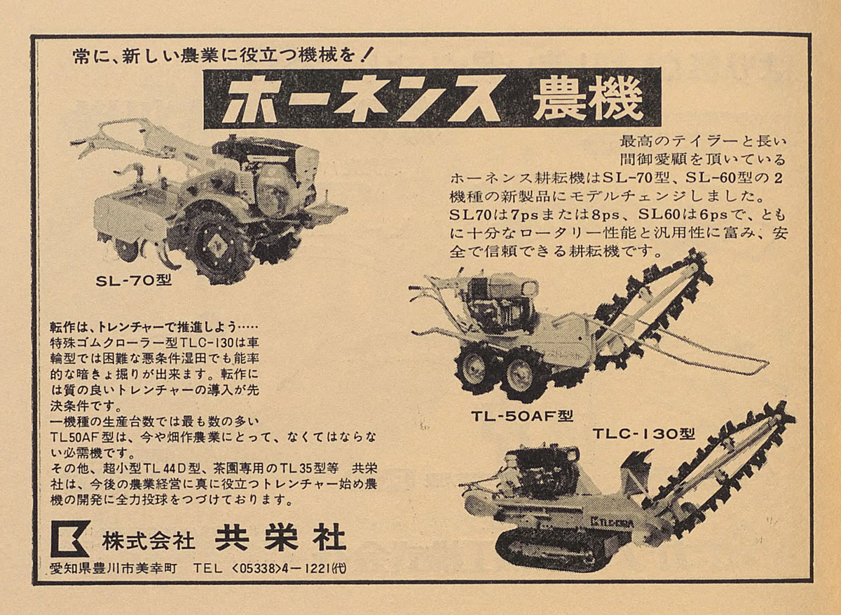 もう実機は見られないであろう運輸省型式の若い番号の古い農機を本や雑誌から探している「朝1分の農機考古学」。今朝は「もう見られない」とまでは行かないものの、見つからなかったので「もうこれでいいか」となった1982年農機実業総覧広告より1979年型式認定ホーネンスSL60です。