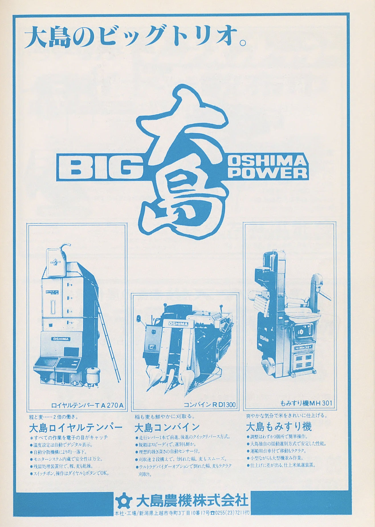 もう実機は見られないであろう運輸省型式の若い番号の古い農機を本や雑誌から探している「朝1分の農機考古学」。今朝は1982年農機実業総覧の広告より1979年型式認定の大島コンバインRD1300です。この年代の大島コンバイン、実機の写真はまだ見たことがありません。