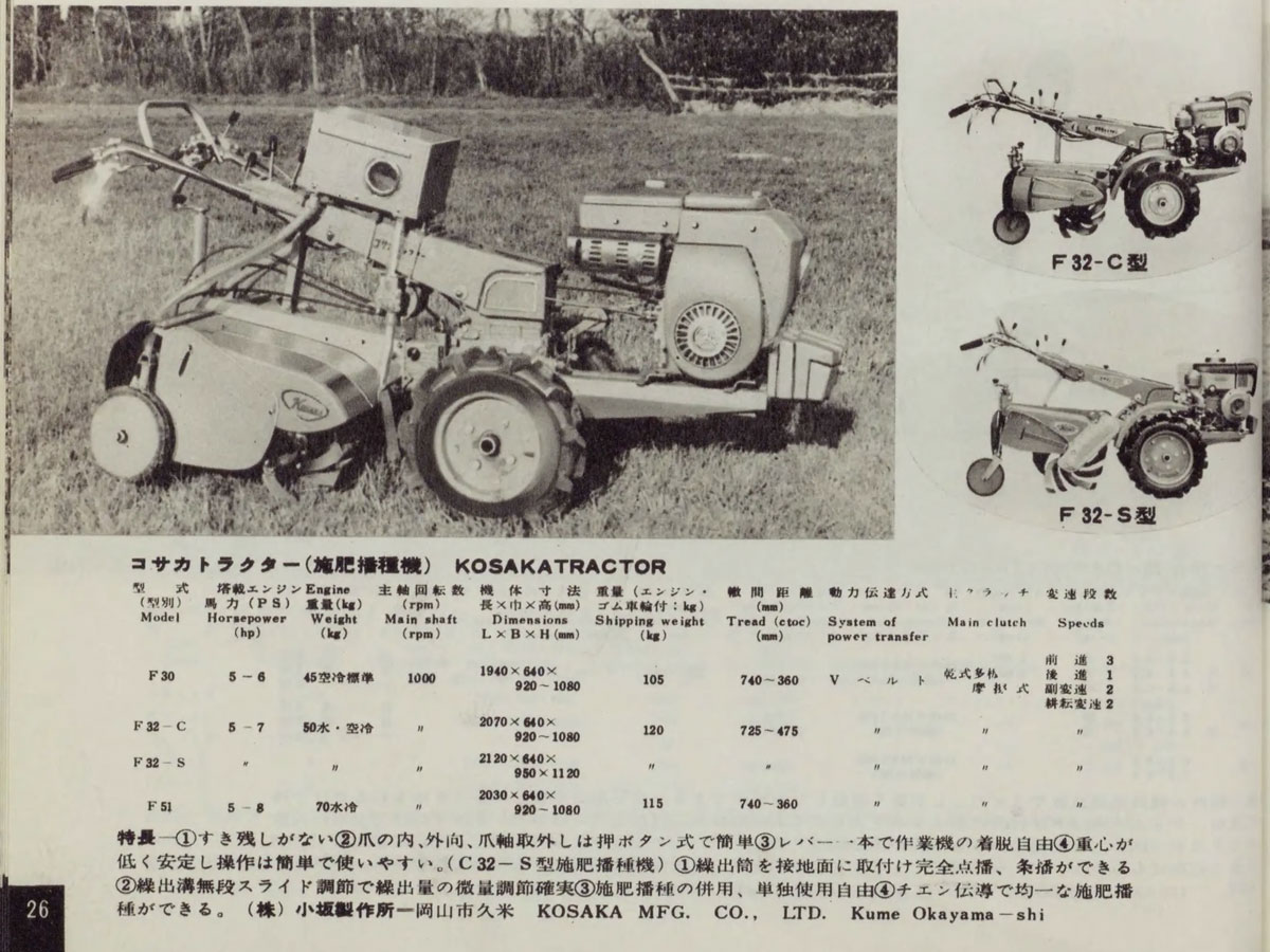 もう実機は見られないであろう運輸省型式の若い番号の農機を探している「朝1分の農機考古学」。今朝は1962年農業機械図鑑の記事から1962年農耕作業用軽自動車型式認定のコサカF32です。当時ダイキンの農機具部門が扱うF32はコサカダイキンF32という名前で売られていました。