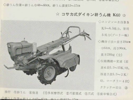 もう実機は見られないであろう運輸省型式の若い番号の農機を探している「朝1分の農機考古学」。今朝は1963年ハンド・トラクタの使い方の記事から1962年農耕作業用軽自動車型式認定のコサカダイキンK60です。昨日の記事で触れたダイキンが資本提携を通じて小坂製作所に「作らせた」ものがこれではないかと思います。