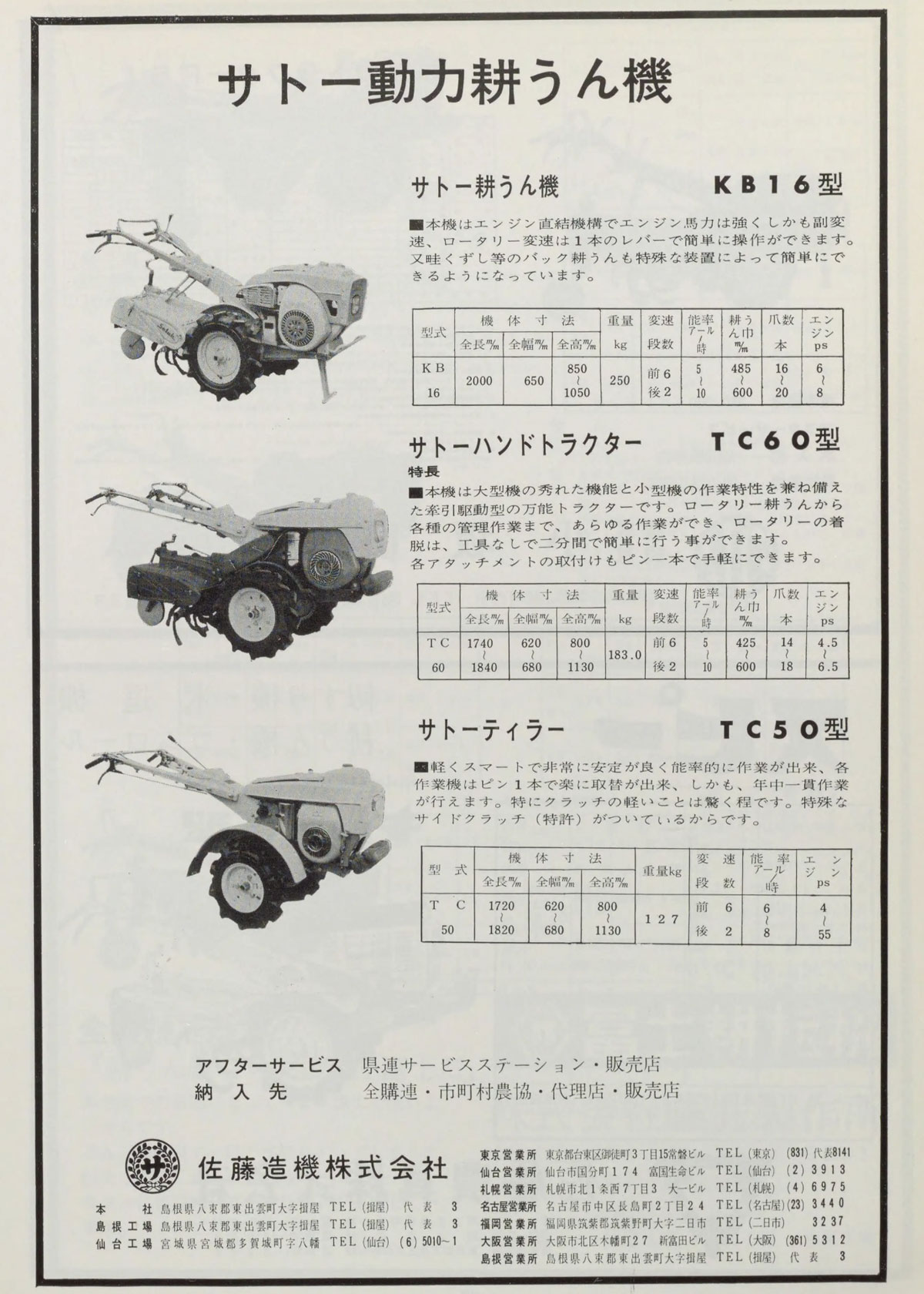 もう実機は見られないであろう運輸省型式の若い番号の農機を探している「朝1分の農機考古学」。今朝は1962年農山漁村近代化施設便覧の広告から1961年型式認定サトー式KB16型です。1959年のホンダの黒船F150と同じ、多分ミッションとエンジン直結ということが謳われていて、その影響が大きかったことが伺えます。