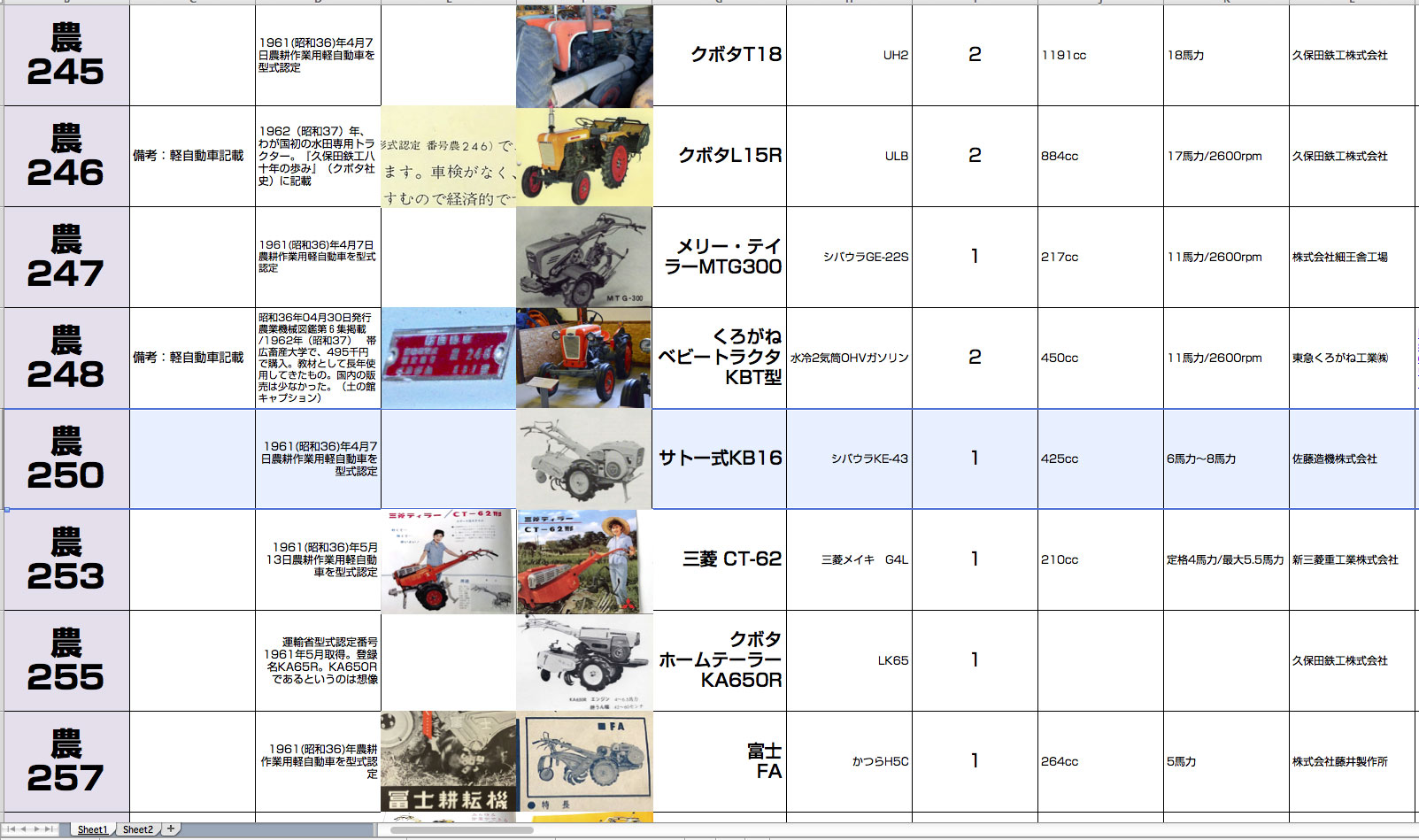 『農機の運輸省型式認定番号一覧表』を固定ページで公開しました。一番上のメニューから入れるようにしています。これから新しく運輸省型式認定番号を発見するたびに追記することにします。