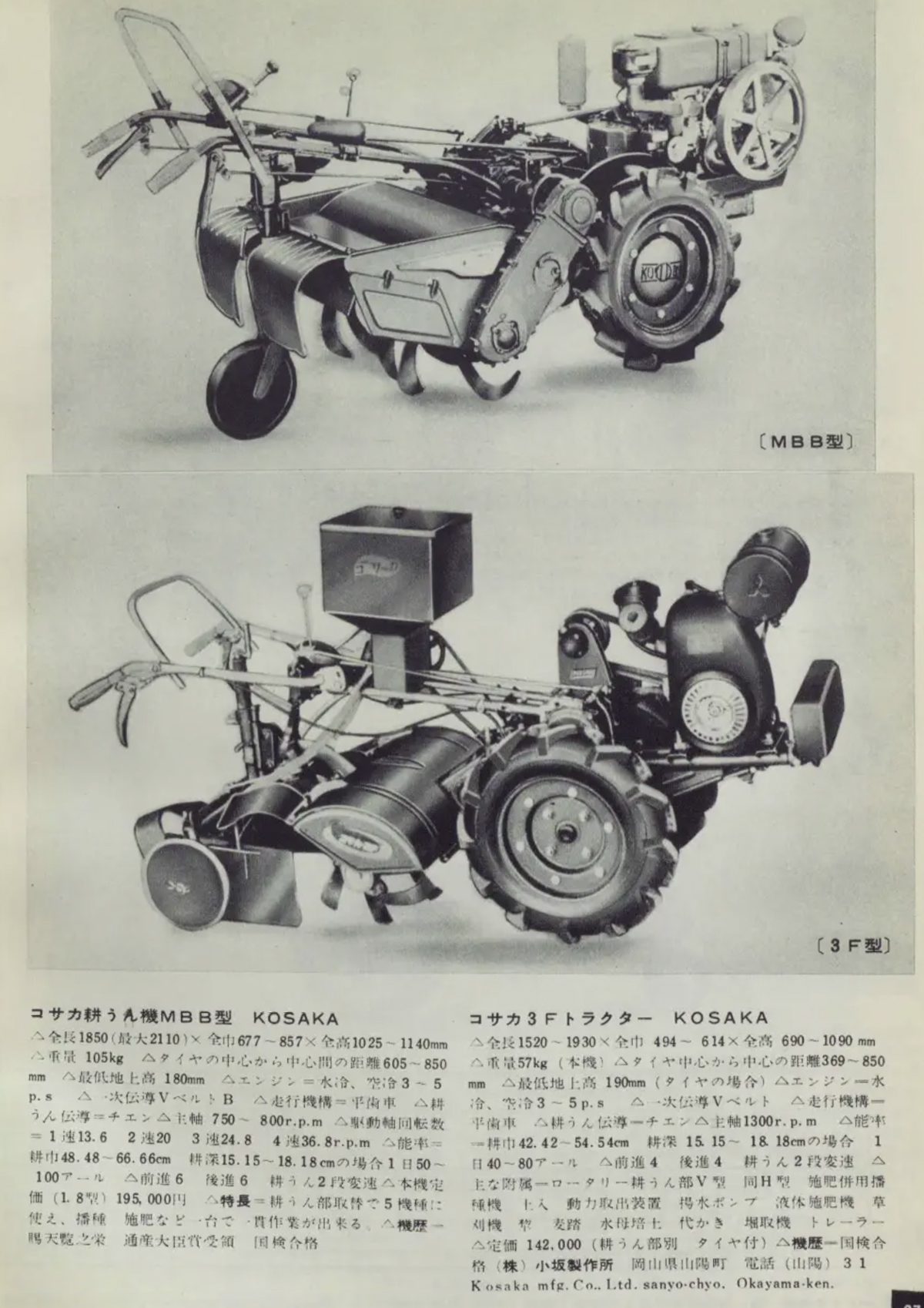 もう実機は見られないであろう運輸省型式の若い番号の農機を探している「朝1分の農機考古学」。今朝は1959年農業機械図鑑の記事から1959年農耕作業用軽自動車型式認定コサカ3F型です。正直どれも同じように見える当時の耕運機ですが、それらが数字ごと綺麗に並ぶ時、また別の姿を表すのだと思ってやっています。