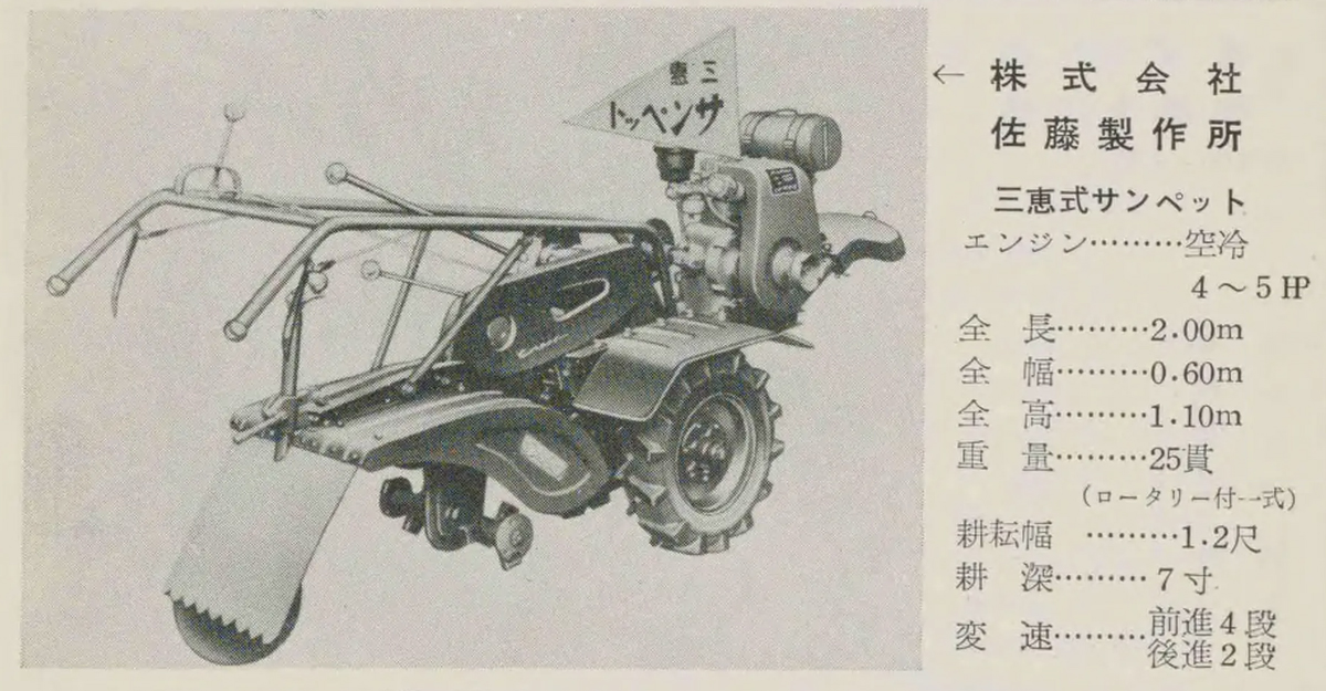 なお、同社では最近の小型化に対応して、昨秋より三恵式サンペットを発売し、今までのテーラー界に話題を賑わしている。同機はサイドクラッチがある為旋回に便利であり、前進二段後退一段のミッション付でしかもローターが極めて合理的に取付けられ、しかも馬力は五馬力まで可能な小型強力なものである。 スキ作業は勿論、管理作業にも充分使いこなせる田畑両用の優秀機として注目を浴びている。 同社では近い裡に必ずペット時代が来ると確信、鋭意製品に邁進している。