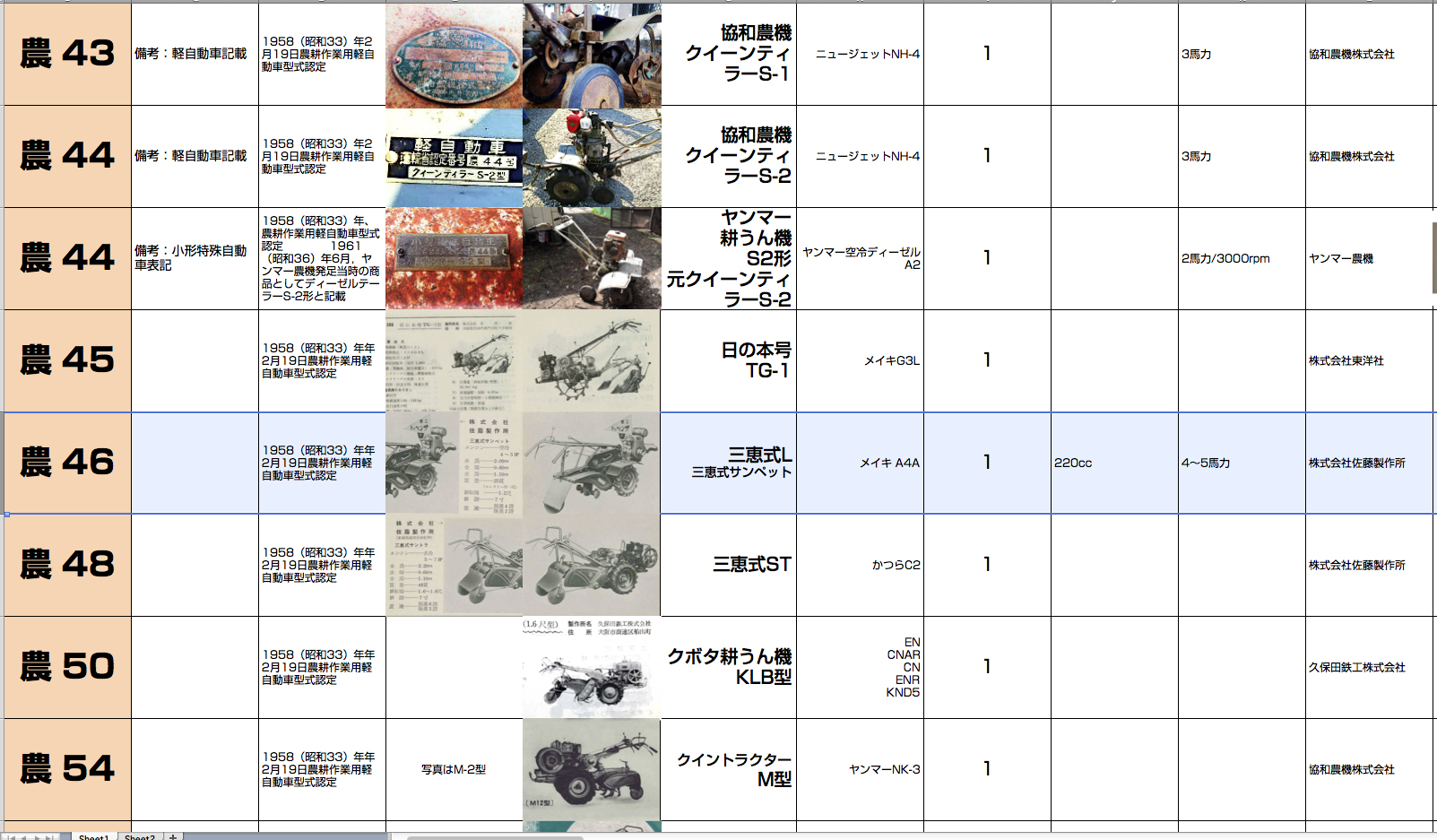 『農機の運輸省型式認定番号一覧表』に追記しました