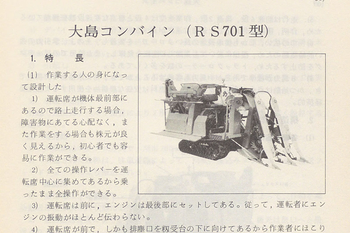 もう実機は見られないであろう運輸省型式の若い番号の古い農機を本や雑誌から探している「朝1分の農機考古学」。今朝は水稲収穫機械化便覧-1973年より1973年型式認定の大島コンバインRS-701です。毎回毎回白黒の味気ない不鮮明写真でごめんなさい。それでも本や雑誌に目を向けることでかなりの古いコンバインを回収することができました。