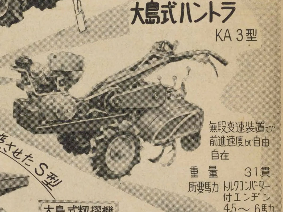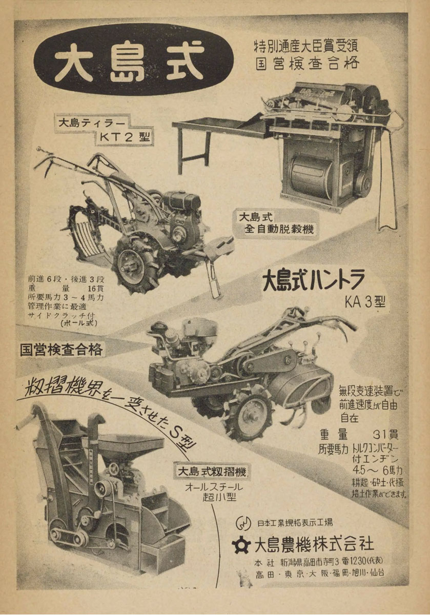 もう実機は見られないであろう運輸省型式の若い番号の古い農機を本や雑誌から探している「朝1分の農機考古学」。今朝は1958年の機械化して行く農作業-第2集の広告からもう一台確認したのが1959年型式認定大島式ハントラKA3型です。先日紹介したKT-2型は1958年型式認定でしたがKA3型は1959年型式認定です。