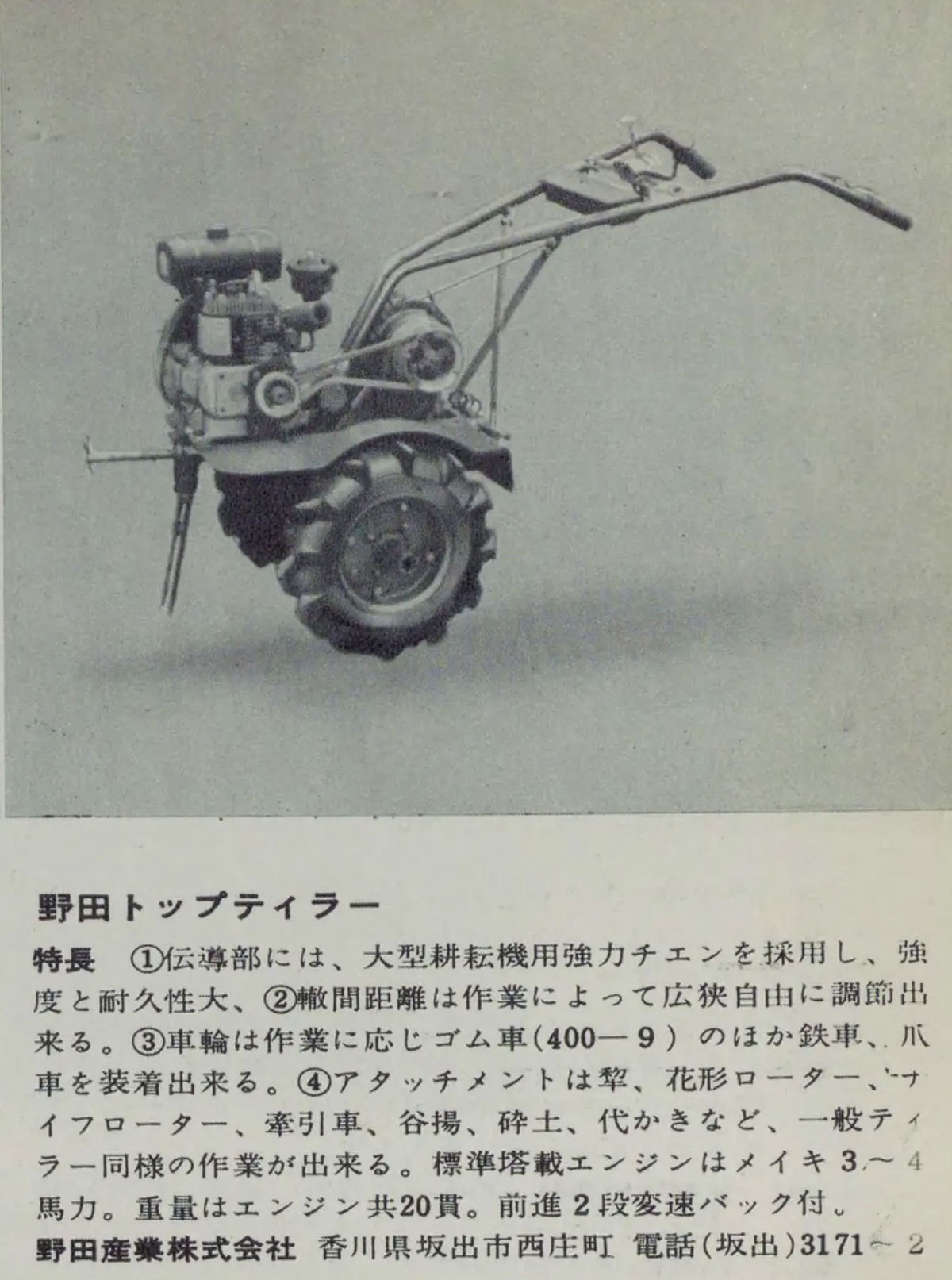 もう実機は見られないであろう運輸省型式の若い番号の農機を探している「朝1分の農機考古学」。今朝は1957年農業機械図鑑の記事から1958年型式認定野田産業野田式トップテイラーT-1型です。記事はトップテイラーとしかありませんが、掲載時期からこれしかないであろうと言うことで収録です。