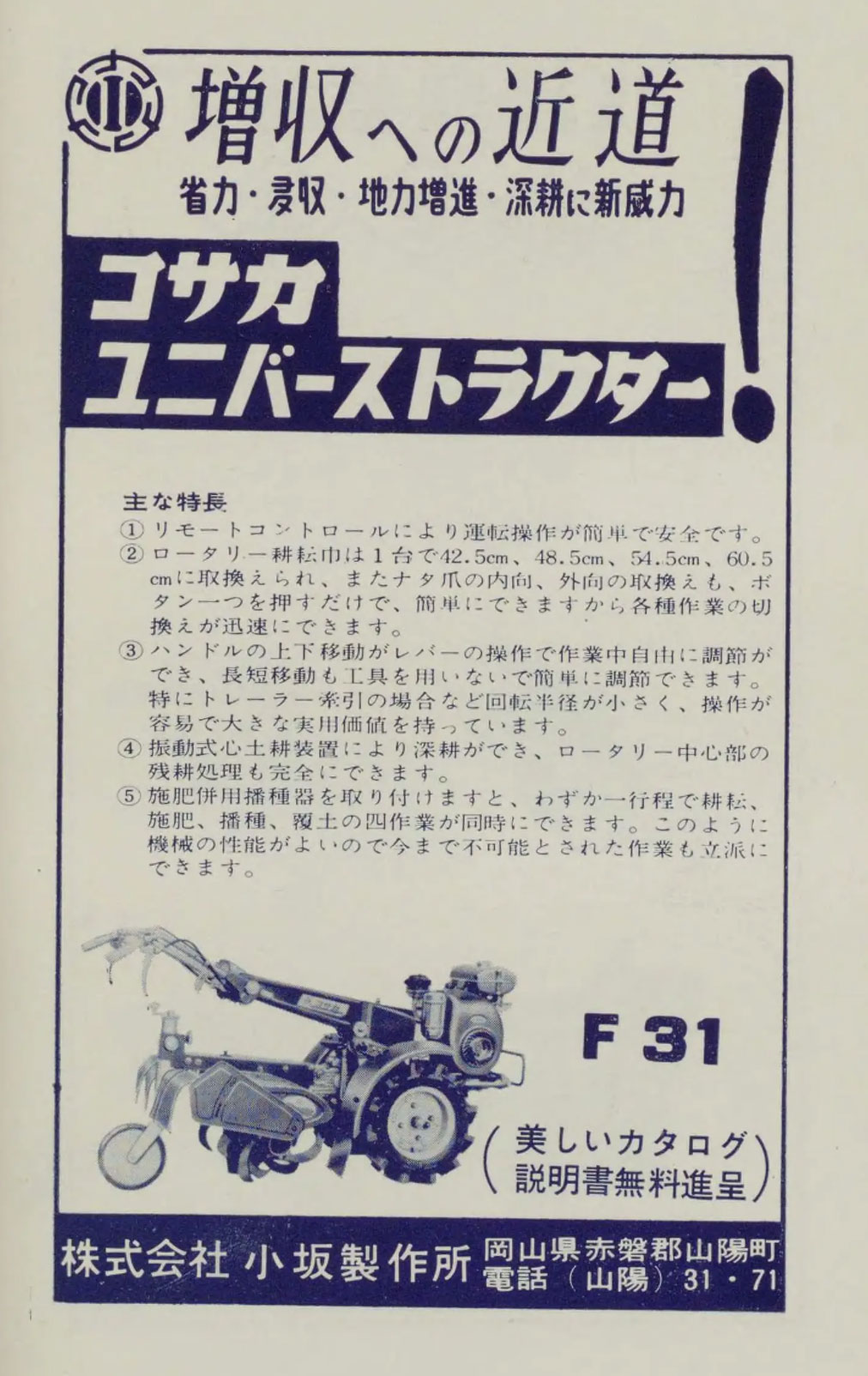 もう実機は見られないであろう運輸省型式の若い番号の農機を探している「朝1分の農機考古学」。今朝は1960年農業機械化教室の広告から1960年農耕作業用軽自動車型式認定コサカF31型(広告ではコサカユニバーストラクターと称していますが運輸省型式ではコサカとだけです)です。