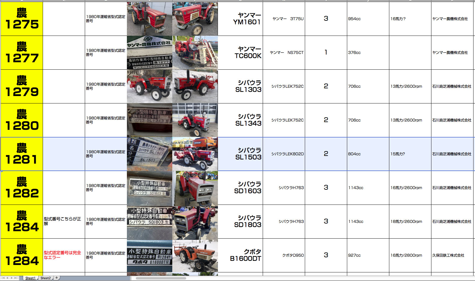 もし表が埋まれば国産の農機で知らないものはない・・・ということになりますし、運輸省型式は申告制で実際の生産年とは多少のズレはあるにせよ、ある物差しにおいてどちらが古いか新しいか知ることができます。まあ、だからと言ってどうなんだという話なのですけど・・・